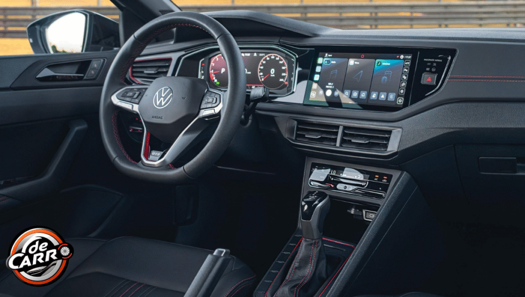 O VW Nivus GTS prioriza detalhes esportivos no interior, como bancos com costura vermelha e volante revestido em couro com aplique em preto fosco. O painel tem acabamento que mistura texturas e detalhes em alumínio, reforçando um ambiente esportivo.